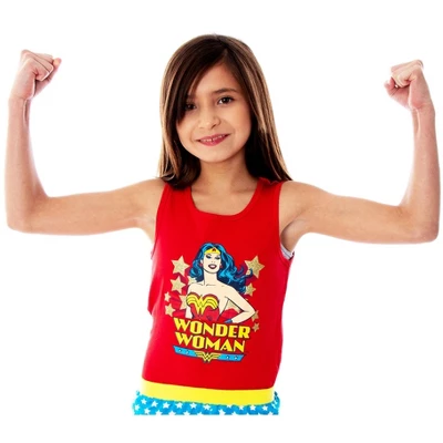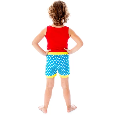 - CLASSIC WONDER WOMAN COSTUME COLORS – The sleeveless tank top is a red color that features a vintage Wonder Woman character design on front with gold glitter accented stars. The pajama shorts in the set have that iconic blue and white star pattern.