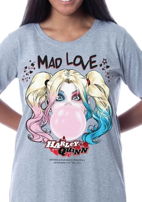 - CLASSIC DESIGN – This pajama dress features Harley Quinn blowing a bubble with the words “Mad Love” above her. The pajama is perfect for curling up in and reading all your favorite DC comics!