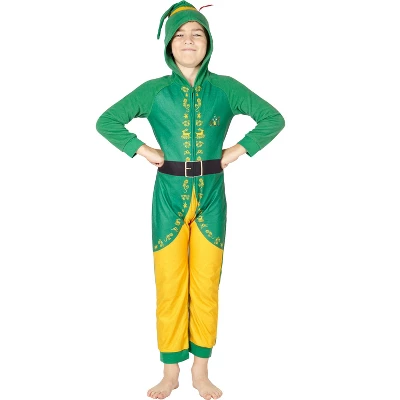 - FRONT COSTUME PRINT DESIGN – Allover front printed design of Buddy the Elf’s outfit. The pullover hoods have a 3D red fabric feather design and a pointy shape, just like Buddy’s hat in the film!
