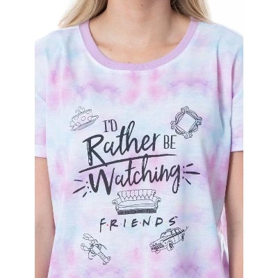 - CLASSIC CHARACTER DESIGN – The pajama set-top features a tie-dye colored top with the words “I’d Rather Be Watching Friends” surrounded by several iconic symbols from the series including a couch, lobster, coffee, and many more! The pants feature a tossed print of all those same symbols.