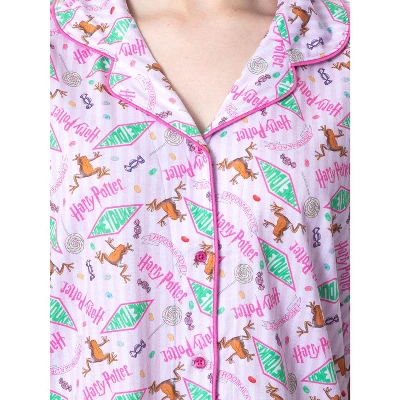 - CLASSIC CHARACTER DESIGN – This pajama set-top features a short-sleeved collared button-down with the Honeydukes candy shop logo. It also features some classic Honeydukes candy such as the chocolate frogs featured in the series, sugar skulls, and many more! The shorts feature the same all-over print. It’s perfect for curling up in and enjoying all your favorite Harry Potter media!