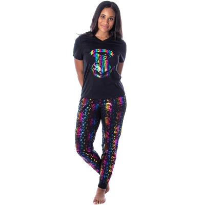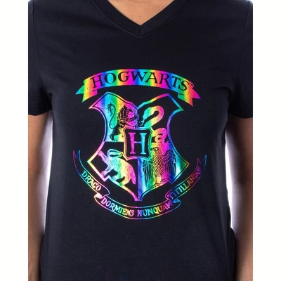 - WONDERFUL, LIGHTWEIGHT RAINBOW FOIL PRINT: This soft loungewear set has the Hogwarts crest in a rainbow foil that is eye-catching and vibrant in color. The top is a short sleeve v-neck, and the bottom is jogger-style pants with a drawstring closure and elastic waistband