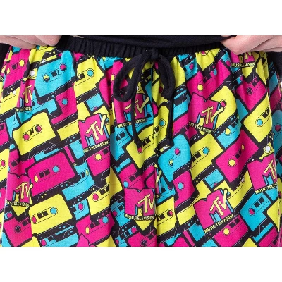 - CLASSIC CHARACTER DESIGN – This pajama set-top features the MTV logo in neon yellow, pink, and blue with the phrase “Music Television” below it. The bottoms feature cassette tapes in those same colors and an all-over print of the same MTV logo.