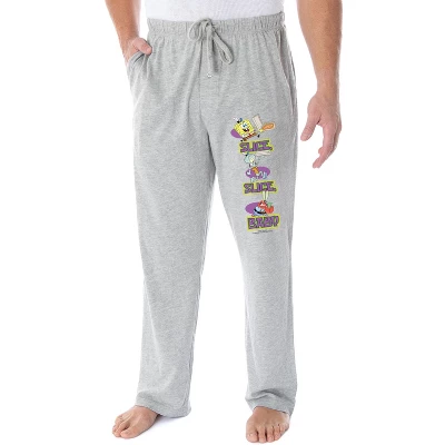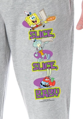 - QUALITY DESIGN PRINTED IN THE U.S.A – These SpongeBob pajama pants have a large 3 character design of SpongeBob, Squidward, and Mr. Krabs and a script logo that reads Slice, Slice, Baby printed on the left pant leg